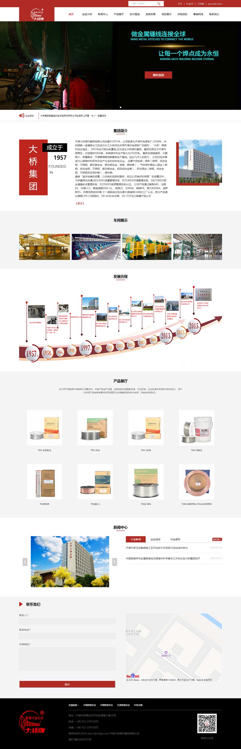 天津大橋焊材集團(tuán)有限公司始建于1957年,1997年進(jìn)行改制,現(xiàn)為股份制企業(yè)。坐落于天津市西青經(jīng)濟(jì)開(kāi)發(fā)區(qū)。是目前中國(guó)知名的綜合性焊接材料制造企業(yè),目前,企業(yè)年生產(chǎn)各類(lèi)焊接材料能力為150萬(wàn)噸,員工4000余人,產(chǎn)品涵蓋各種類(lèi)型的電焊條、氣體保護(hù)實(shí)芯焊絲、藥芯焊絲、埋弧焊絲、TIG焊絲、銅焊絲、鋁焊絲和燒結(jié)焊劑,產(chǎn)品品種350余個(gè),用于橋梁、船舶、壓力容器、機(jī)車(chē)車(chē)輛、航天、石油、海上鉆井平臺(tái)、港口建設(shè)及核軍事建設(shè)等領(lǐng)域。 五十年代,中國(guó)第一座長(zhǎng)江大橋——武漢長(zhǎng)江大橋建設(shè)時(shí),第一次在重點(diǎn)工程中使用了國(guó)內(nèi)生產(chǎn)(天津市電焊條廠)的電焊條,使得當(dāng)時(shí)的天津市電焊條廠擁有了一個(gè)響亮的品牌“大橋牌”。從此“大橋牌”焊接材料產(chǎn)品走遍了中國(guó),走向了世界。