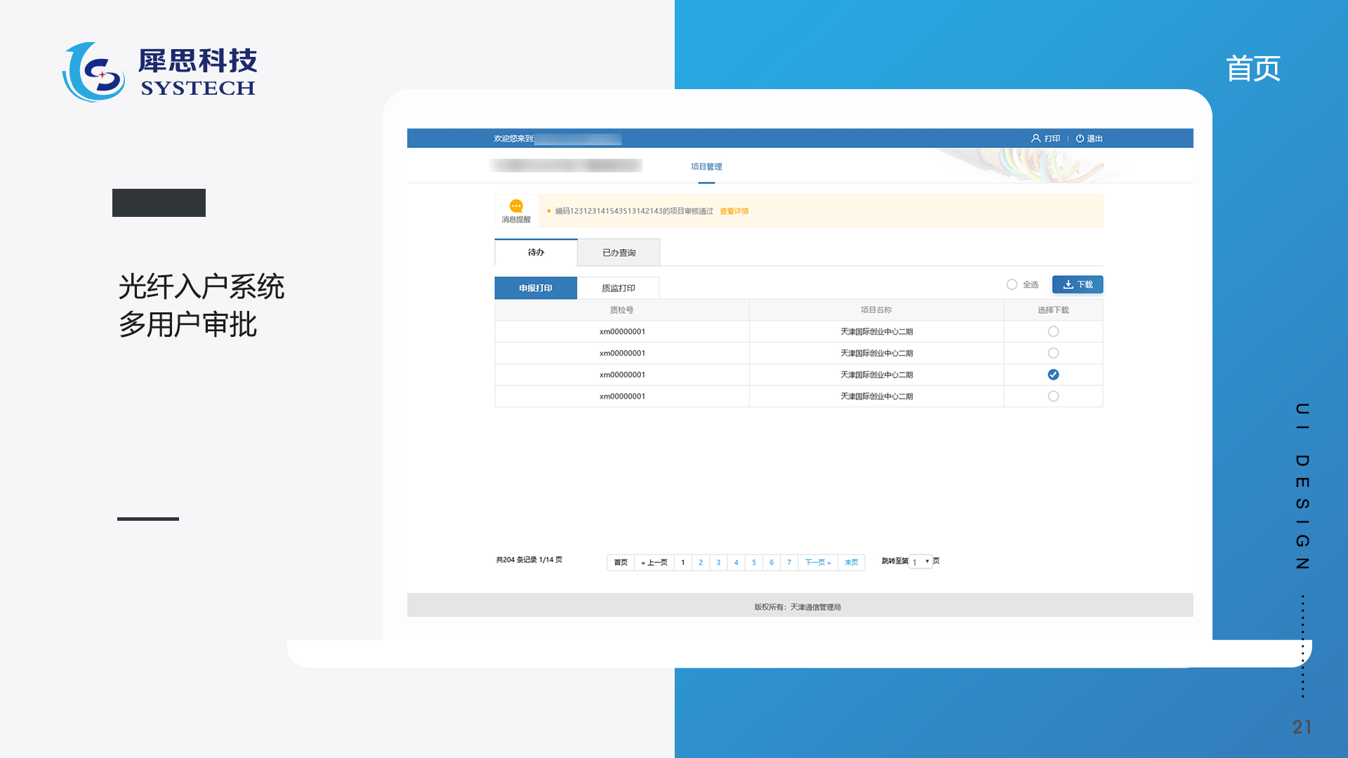 光纖入戶系統(tǒng),是天津市犀思科技有限公司與天津市通信管理局、三大通信運(yùn)營商、開發(fā)商、光纖入戶辦公室合作項(xiàng)目,