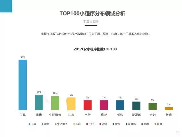 小程序數(shù)量排名前三位的分別是:工具類(lèi)36%、零售類(lèi)11%、生活服務(wù)類(lèi)10%