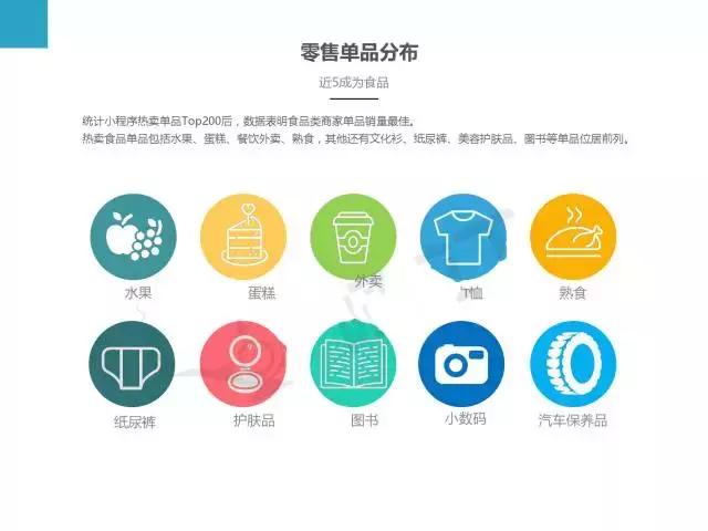 零售類(lèi)小程序中熱賣(mài)產(chǎn)品依次為:水果、蛋糕、外賣(mài)、T恤、熟食