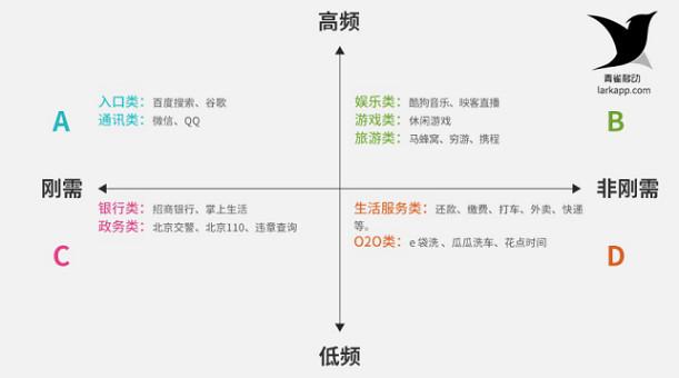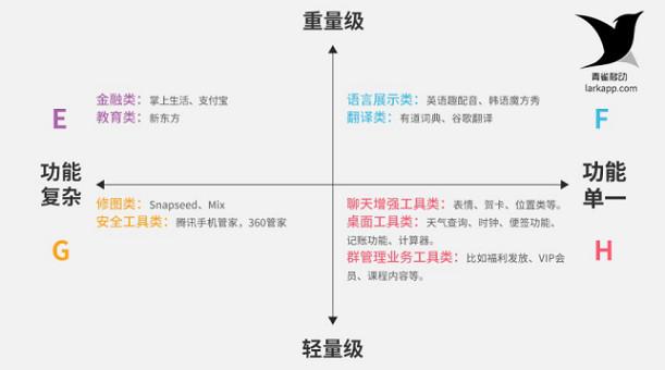 我們先來解讀一下張小龍說的話:微信小程序是一種無處不在、觸手可及、隨時可用、用完即走的小應(yīng)用。話中提到小字,再想想名字也是“小”程序,可見,低頻,非剛需,輕量級、功能單一,不需要調(diào)動太多系統(tǒng)級能力的應(yīng)用似乎更適合小程序。