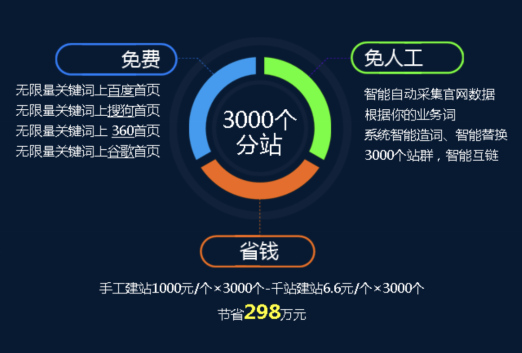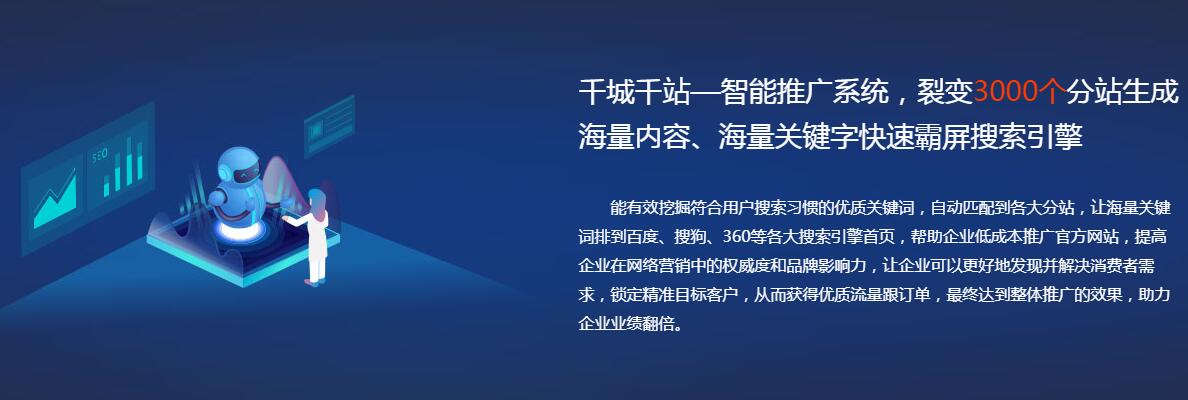 千城千站是通過(guò)人工智能進(jìn)行系統(tǒng)推廣,在一定基礎(chǔ)上保證適應(yīng)搜索引擎的算法規(guī)則,通過(guò)系統(tǒng)智能采集官網(wǎng)數(shù)據(jù)、智能造詞、智能替換創(chuàng)建3000個(gè)站群,實(shí)現(xiàn)多收錄、提權(quán)重、升排名、省成本等營(yíng)銷(xiāo)推廣效果。除此之外,千站主打的“幫助企業(yè)低成本推廣官方網(wǎng)站”的slogan,也給網(wǎng)站運(yùn)營(yíng)者帶來(lái)新一波沖擊,直抓心頭痛。