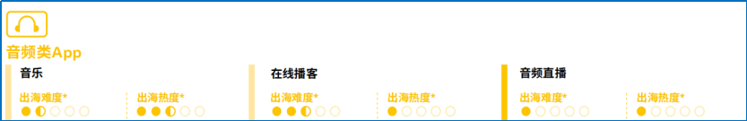而余下的音樂(lè)、K 歌和播客賽道則顯得不溫不火。在 Facebook 發(fā)布的白皮書中在線音頻和在線播客的出海熱度都僅有一顆星,而音樂(lè)類 APP 稍好一些達(dá)到了 2 星半。