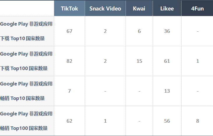 和國(guó)內(nèi)已經(jīng)已經(jīng)定形成“抖音+快手”的兩極格局不同,國(guó)外目前的競(jìng)爭(zhēng)格局更像“TikTok+其他短視頻 APP”的一超多強(qiáng)局面。除了 TikTok,快手旗下的 Kwai、Snack Video,歡聚旗下 Likee,專注印度和中東市場(chǎng)的 4Fun 的成績(jī)也都很不錯(cuò)。