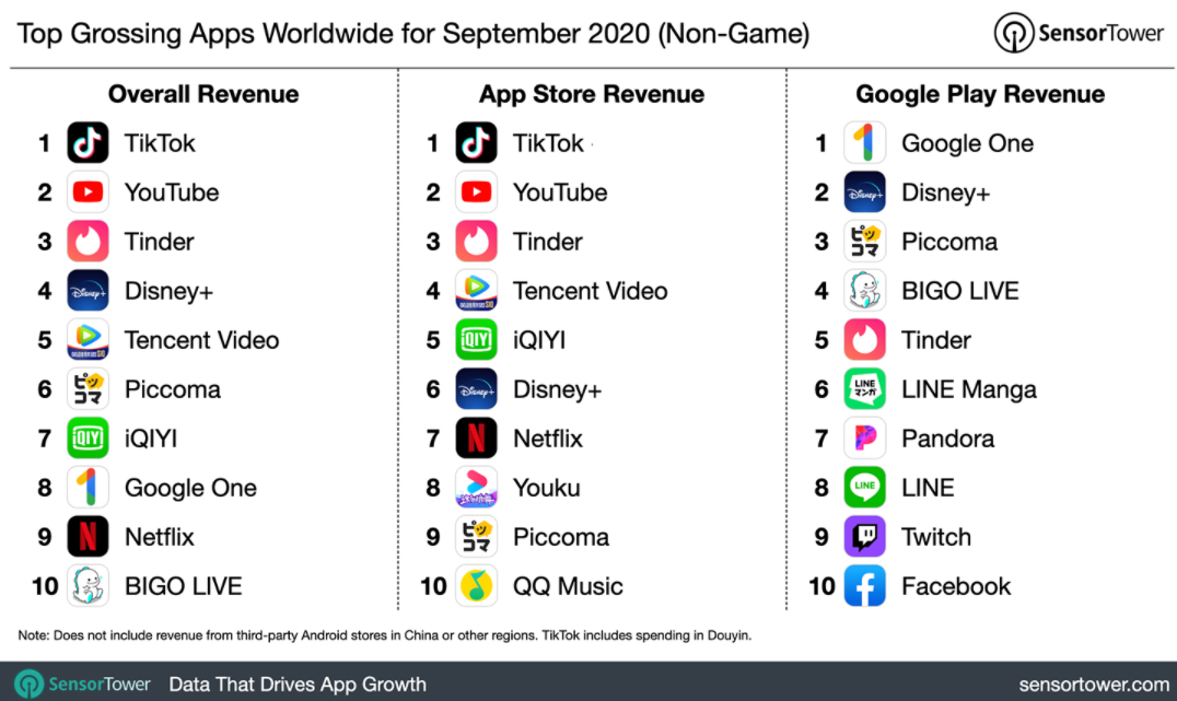 根據(jù) Sensor Tower 數(shù)據(jù),9 月全球最暢銷的 10 款 APP 中有 7 款都是視頻 APP,4 款來(lái)自中國(guó)。在 7 款視頻 APP 中,5 款長(zhǎng)視頻 APP,1 款短視頻 APP,1 款直播 APP(注:YouTube 暫且歸在長(zhǎng)視頻內(nèi))。