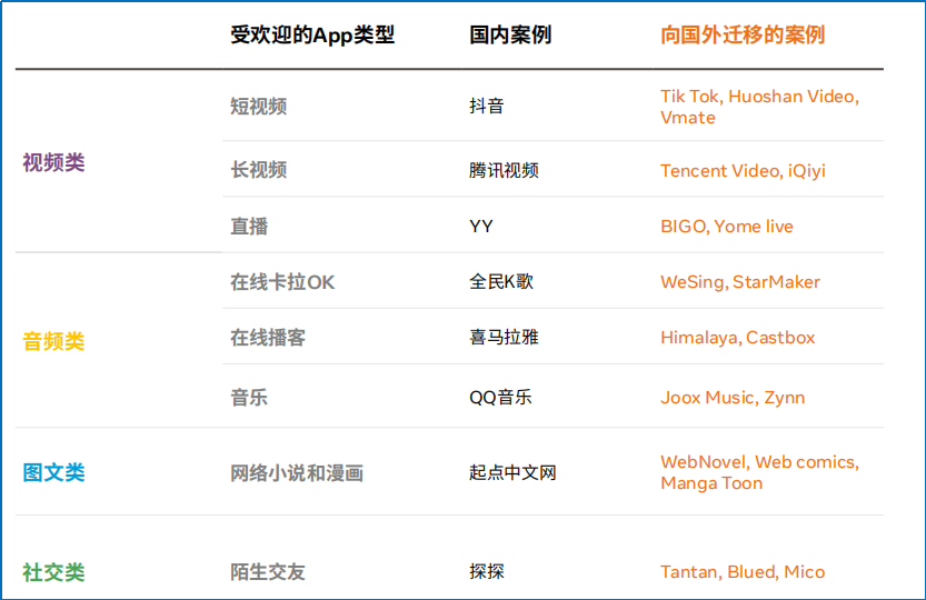Facebook 在白皮書中將社交娛樂(lè) APP 按照展現(xiàn)形式劃分為視頻、音頻、圖文和社交類,每個(gè)類別下又可以劃分為 2-4 個(gè)小類別。數(shù)據(jù)顯示,2020 年出海最多的 APP 類別依次是圖文類、視頻類、音頻類和社交類。