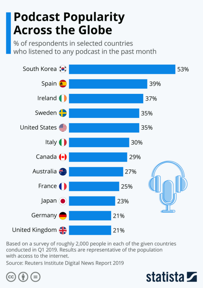 另外 Statista 也發(fā)布過(guò) 2019 年的播客調(diào)查數(shù)據(jù),有 12 個(gè)國(guó)家超過(guò) 20% 以上的用戶在 2019 年 Q1 收聽(tīng)了播客。