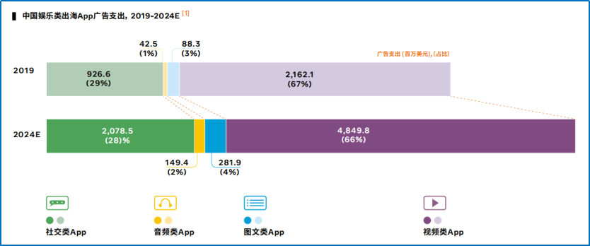 而社交類產(chǎn)品雖然出海數(shù)量并不算多,但在廣告營(yíng)銷上的支出出手可以說(shuō)是非常“闊綽”了。出海廣告支出最多的 APP 類別依次是視頻類、社交類、圖文類、音頻類。而在 2019 年,中國(guó)娛樂(lè)類出海 APP 的廣告支出有 32.2 億美元。