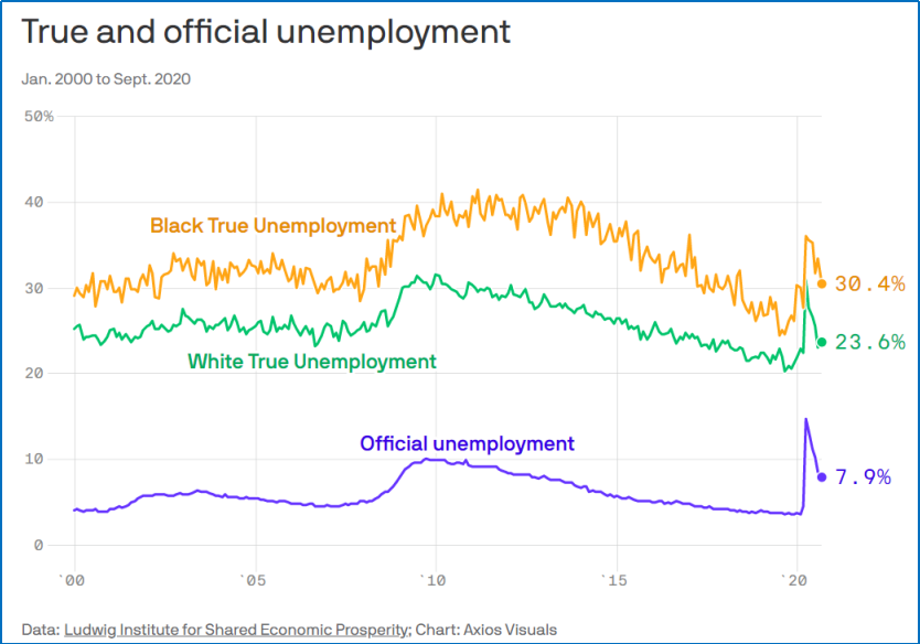 另外,根據(jù) Ludwig Institute 分享的數(shù)據(jù),目前美國(guó) 16 歲以上的公民中僅有 40.8% 的黑人和 46.1% 的白人有一份年薪超過(guò) 2 萬(wàn)美元的全職工作,失業(yè)率高達(dá) 26.1%。