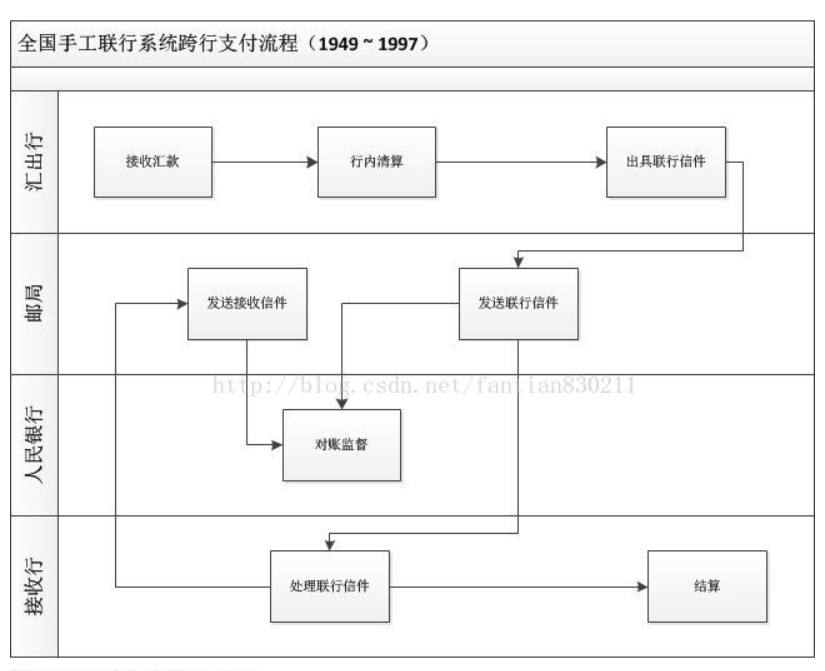 從圖中我們可以看出整個(gè)流程下來,耗時(shí)長,靠的是郵局送聯(lián)行信件,耗時(shí)1周左右。